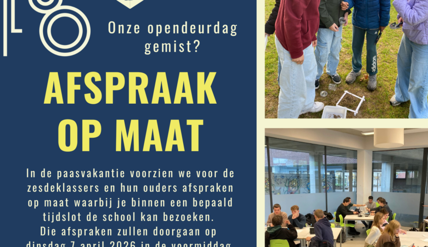 Heb je onze opendeurdag gemist? Had je een andere afspraak waardoor je ons geen bezoekje kon brengen? En ben je toch nieuwsgierig naar het reilen en zeilen op onze school? Boek dan je afspraak op maat op dinsdag 7 april 2026 tijdens de voormiddag! Zesdeklassers en hun ouders kunnen via deze link een tijdslot boeken […]